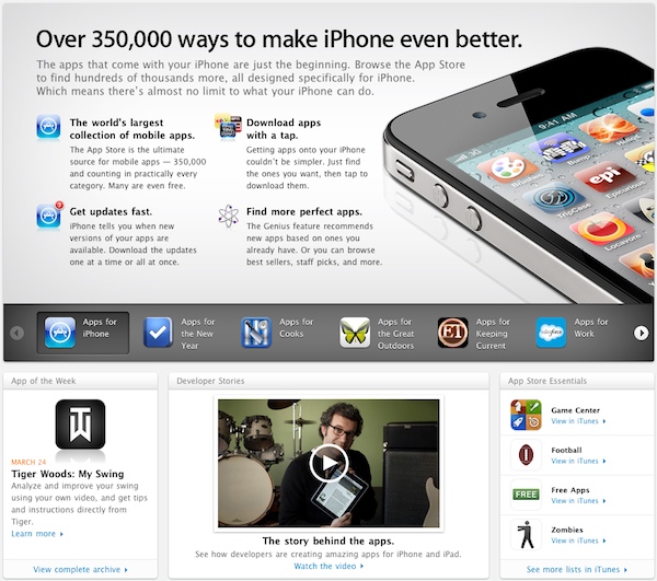 Η Apple ανανέωσε το website της προσθέτοντας μία νέα σελίδα με τίτλο Apps for iPhone. Η νέα σελίδα παρουσιάζει επιλεγμένες εφαρμογές ανά κατηγορία και αποτελεί έναν ακόμη τρόπο για να εντοπίσετε μία αξιόλογη εφαρμογή η οποία έχει χαθεί μέσα στις χιλιάδες διαθέσιμες του App store.